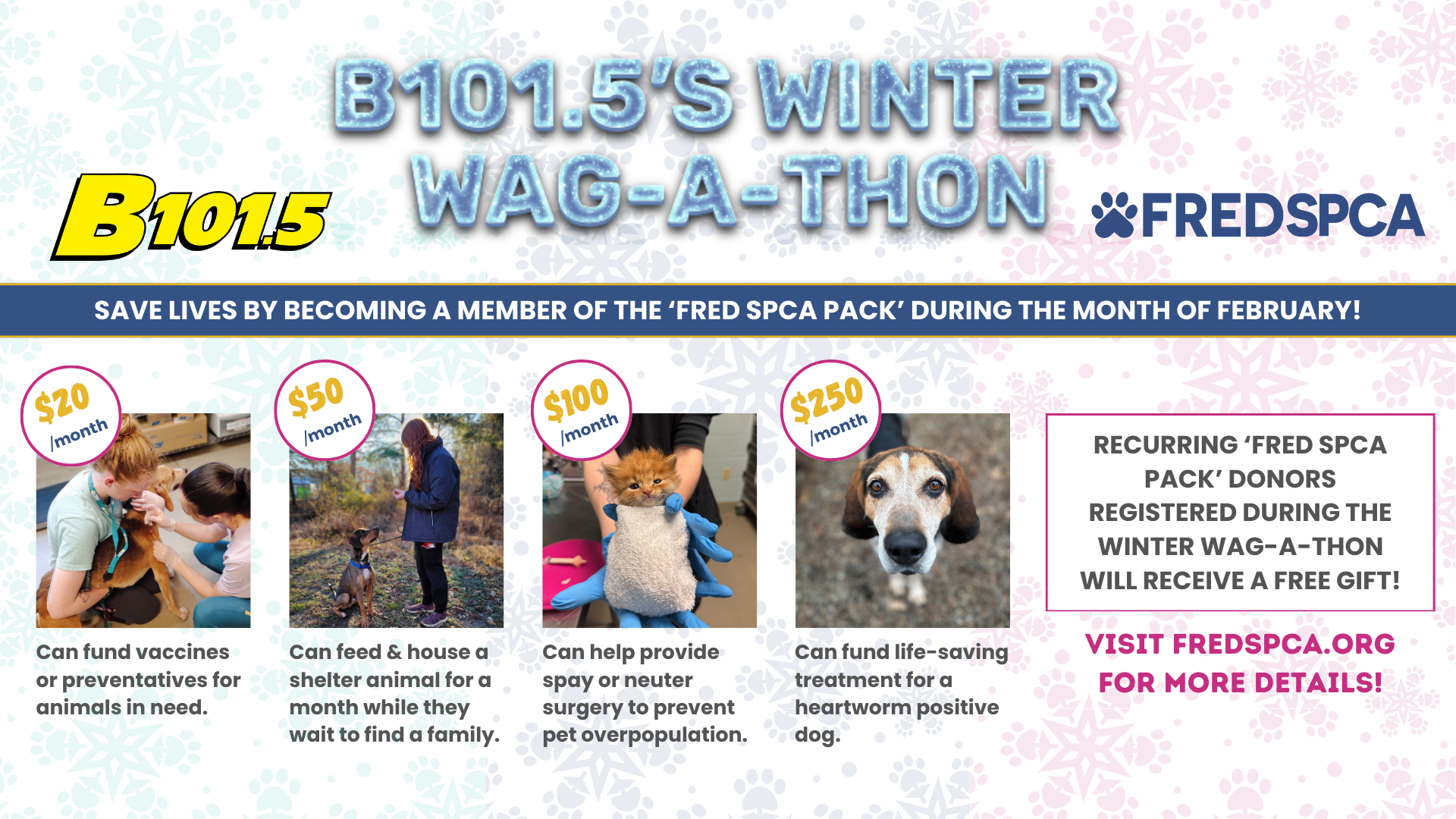 B101’s Winter Wag-a-Thon benefiting the Fredericksburg SPCA is happening February 1 – 28! You can become a monthly supporter and give the gift that keeps on giving. Your ongoing support provides vital resources that help us care for animals and assist families in need—ensuring the Fredericksburg SPCA is here for years to come.