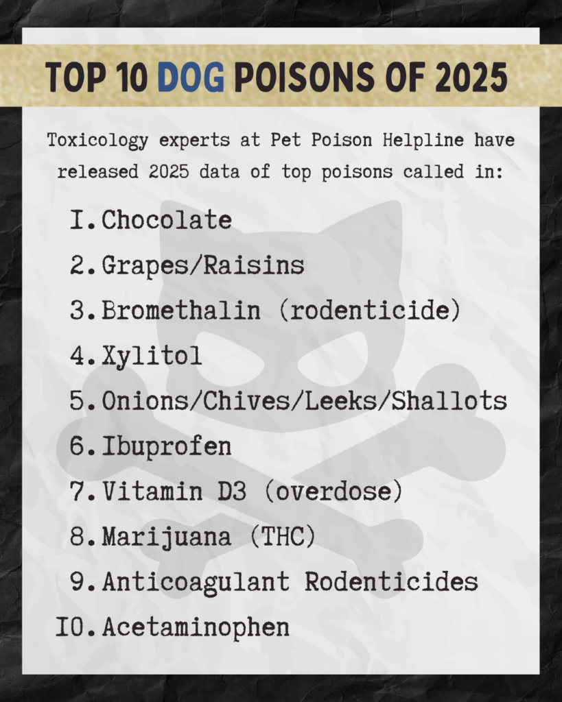 Chocolate and grapes remain common hazards because pets are naturally attracted to them, and backyard rodent poisons still show up in calls. Xylitol, the sugar substitute found in sugar-free foods, is also a frequent concern.