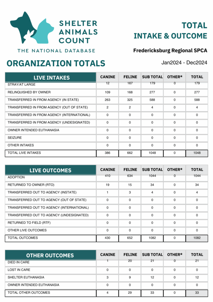 Each year, the Virginia Department of Agriculture and Consumer Services (VDACS), compiles and publicizes data from animal shelters, rescues, and organizations around the state. These statistics show, among other things, the number of animals taken in and the number of animals adopted out over the year. The live-release rate is calculated by the total number of live outcomes divided by the total number of outcomes. The Fred SPCA had a live release rate of 97% in 2024.