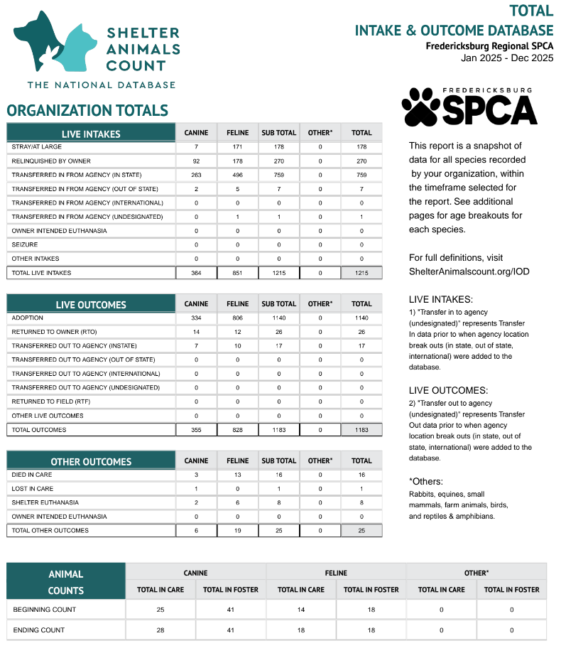 Each year, the Virginia Department of Agriculture and Consumer Services (VDACS), compiles and publicizes data from animal shelters, rescues, and organizations around the state. These statistics show, among other things, the number of animals taken in and the number of animals adopted out over the year. The live-release rate is calculated by the total number of live outcomes divided by the total number of outcomes. The Fred SPCA had a live release rate of 98% in 2025.